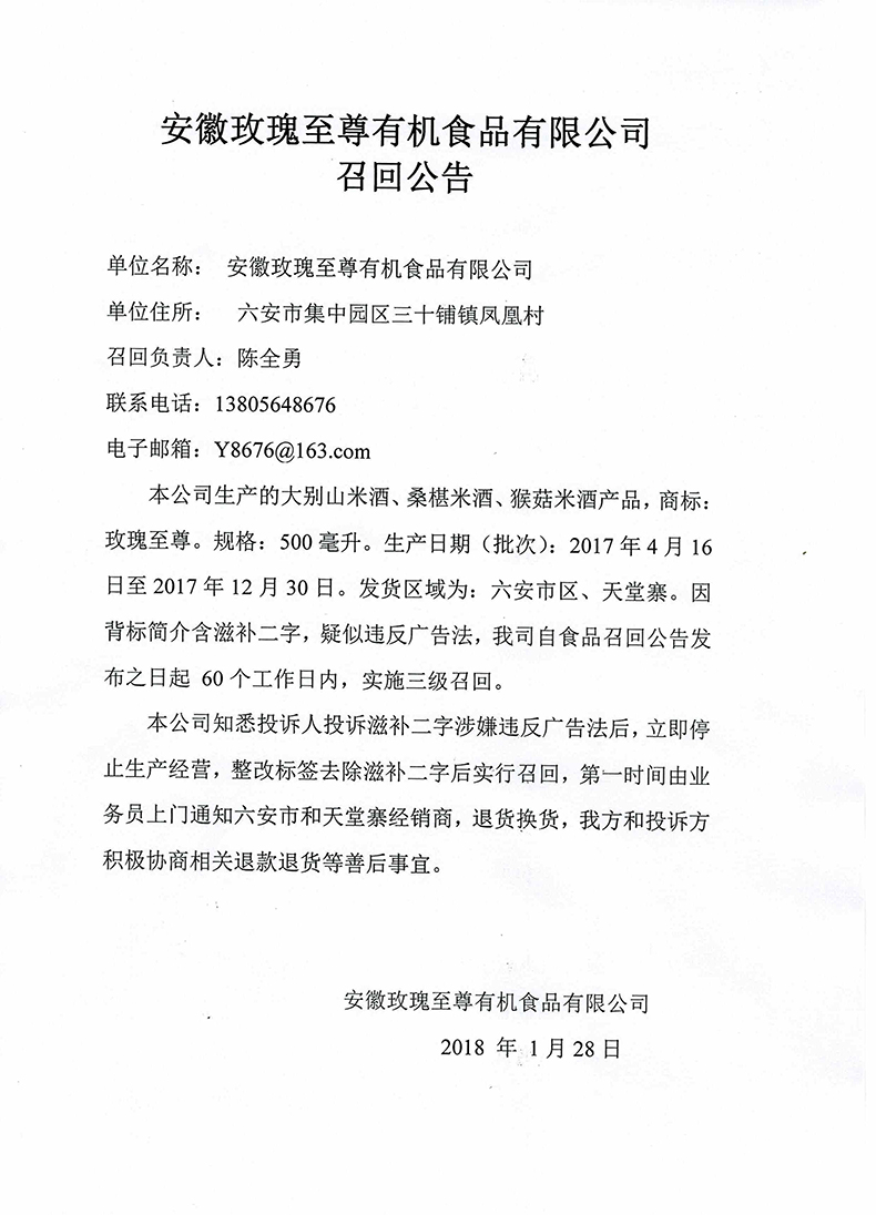 安徽玫瑰至尊有机食品有限公司-召回公告